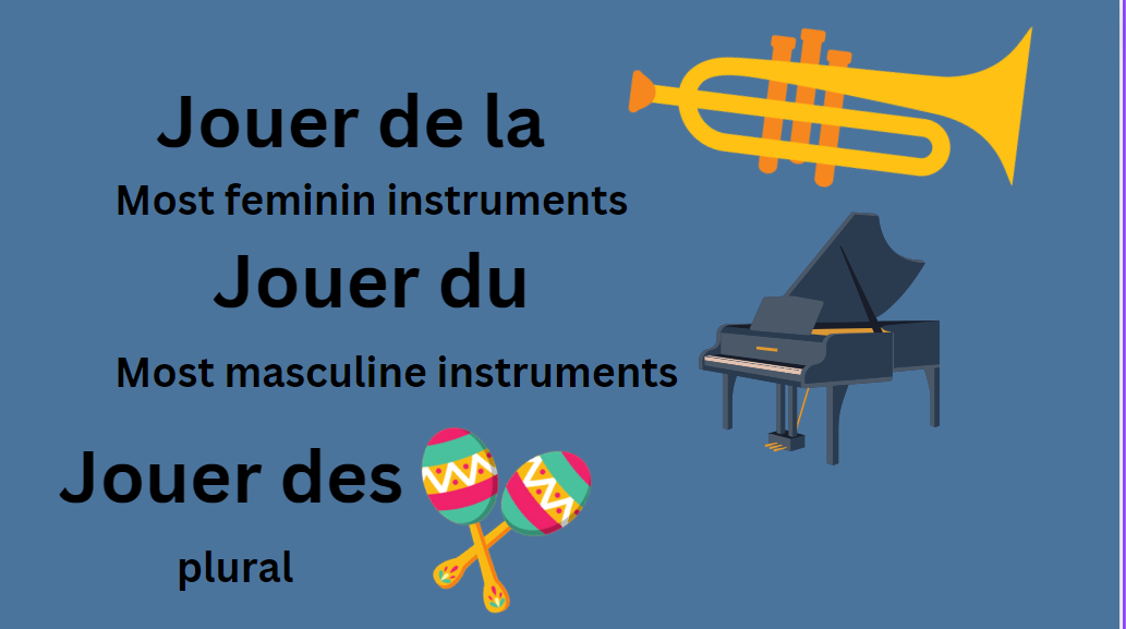 Faites écouter un instrument à votre classe, leur demander lequel c’est et l’assiocer avec du/de la ou des.